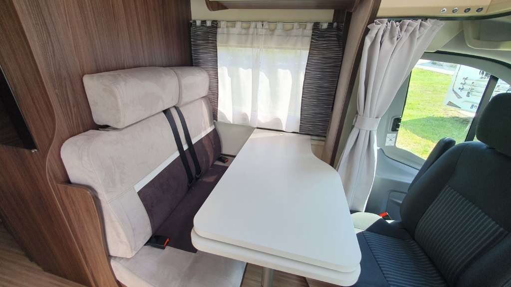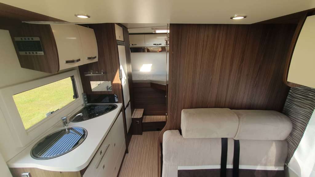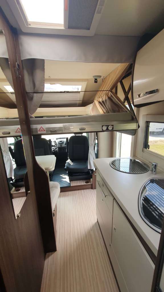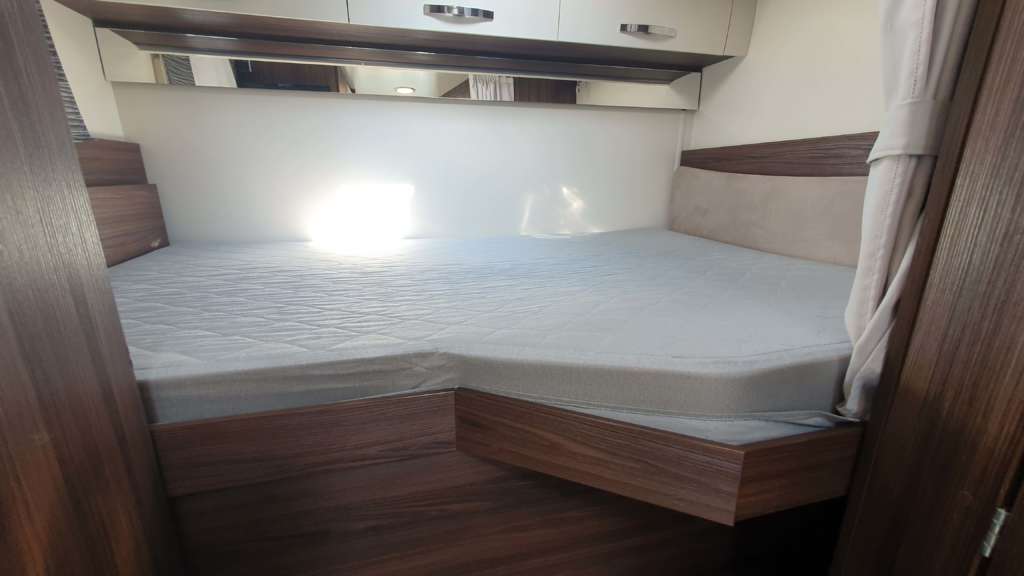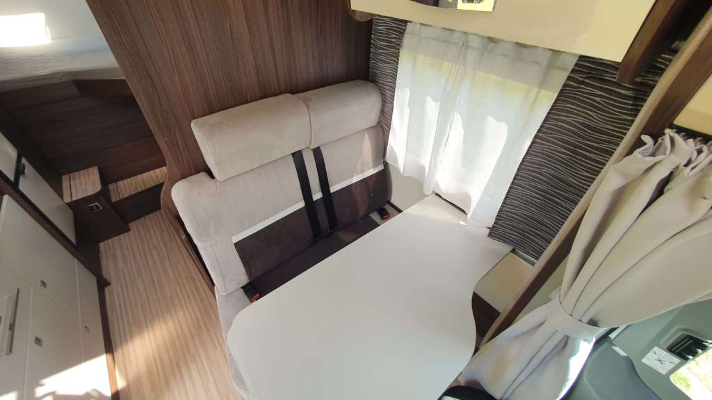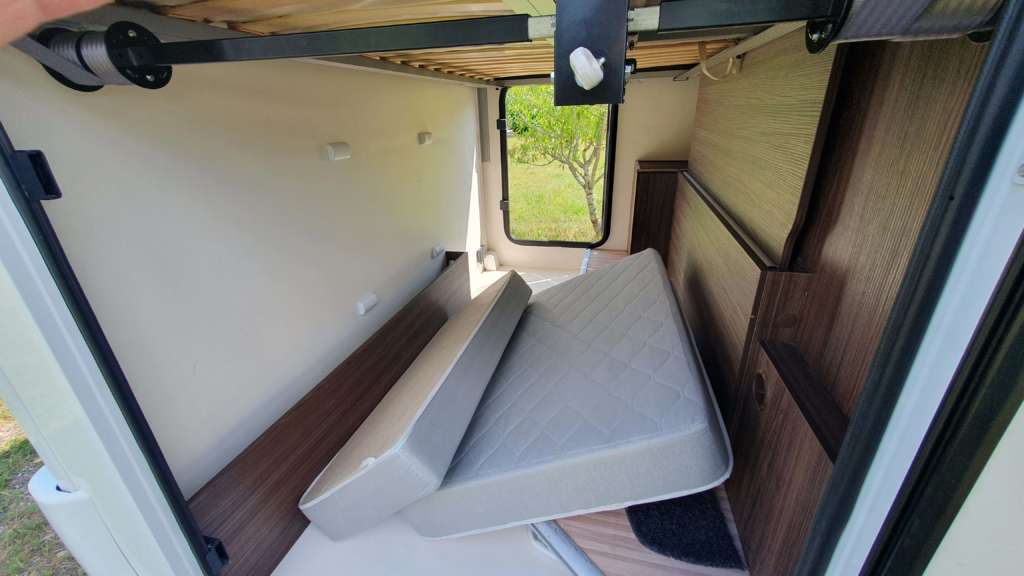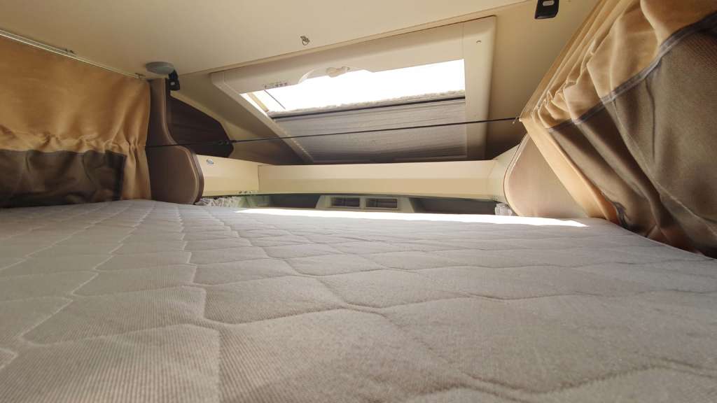 Camas de 90×210 cm(Comedor), 131/109×203 cm(Trasera) y 140/74×191 cm(Suspendida del techo).