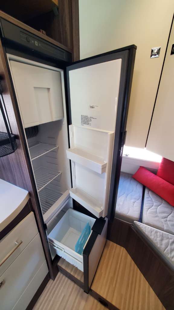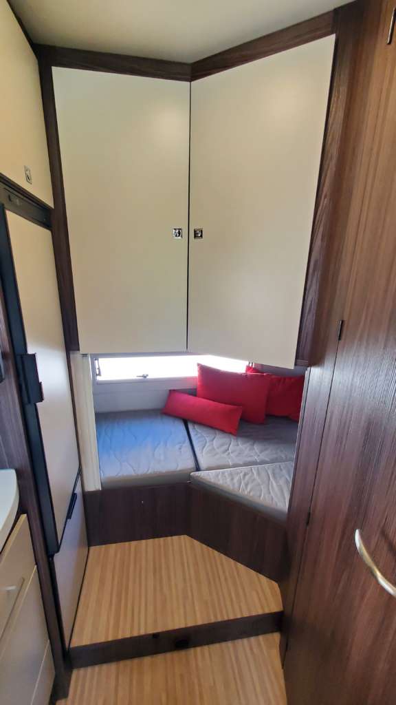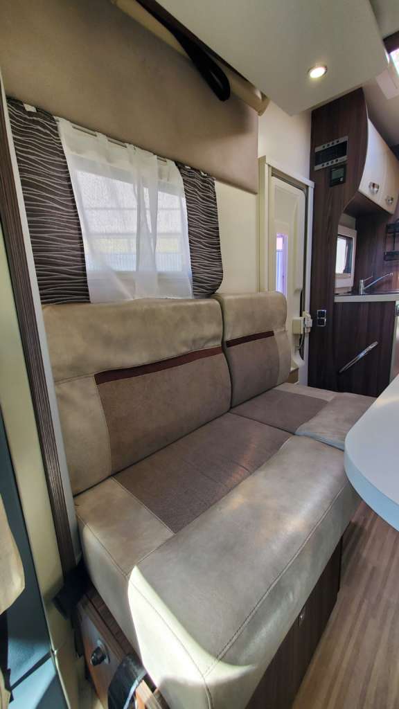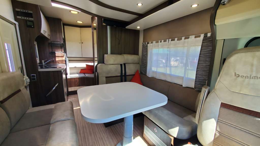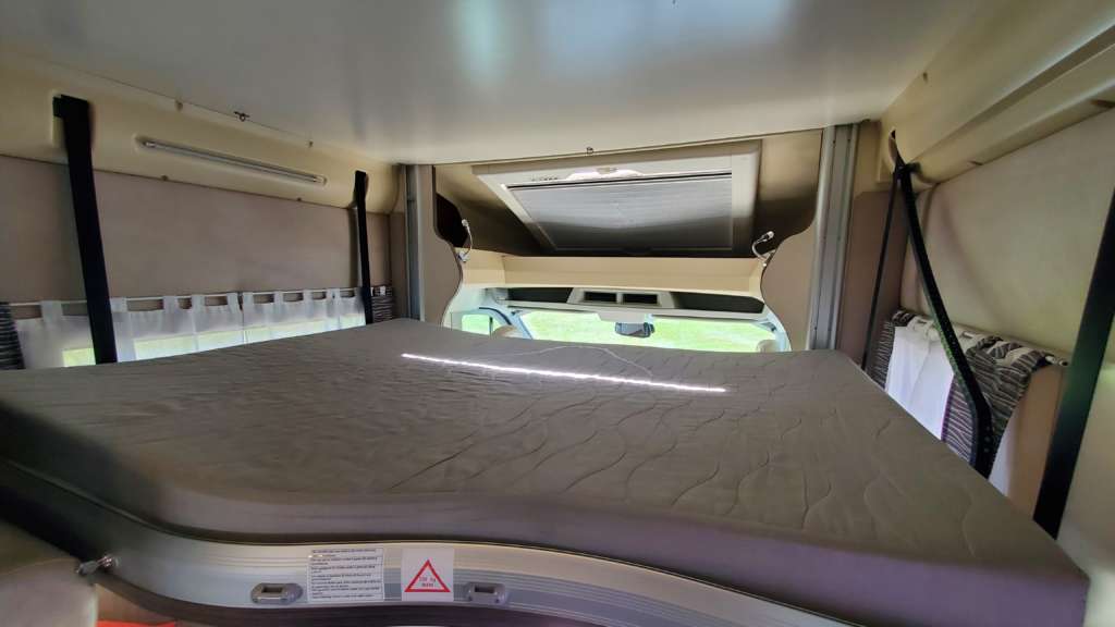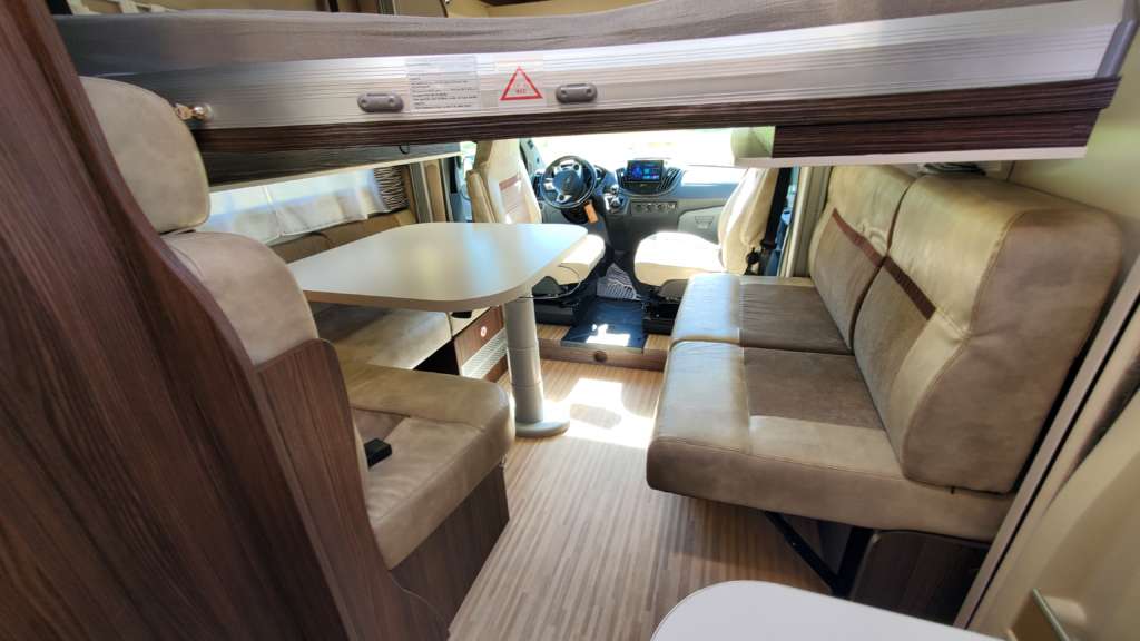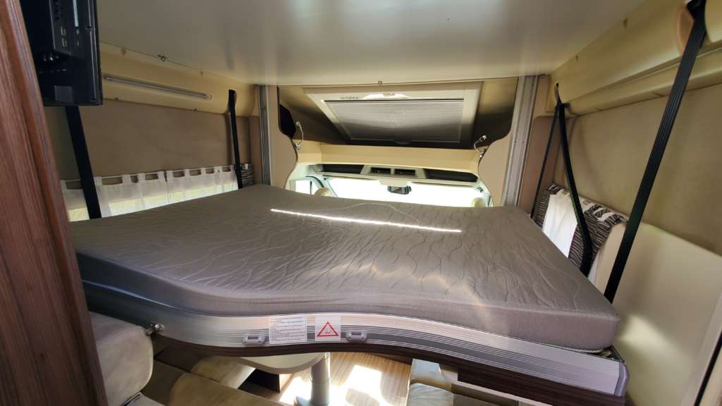 Cama 1 plaza desmontable en la zona trasera Cama suspendida de techo eléctrica 2 PLAZAS (máx. 230 kg) Cama suspendida del techo (cm) : 140/120×191 Comedor (cm) : 140×210 Gran frigorífico 140 l con cajón independiente para 9 botellas de 1, 5 l.