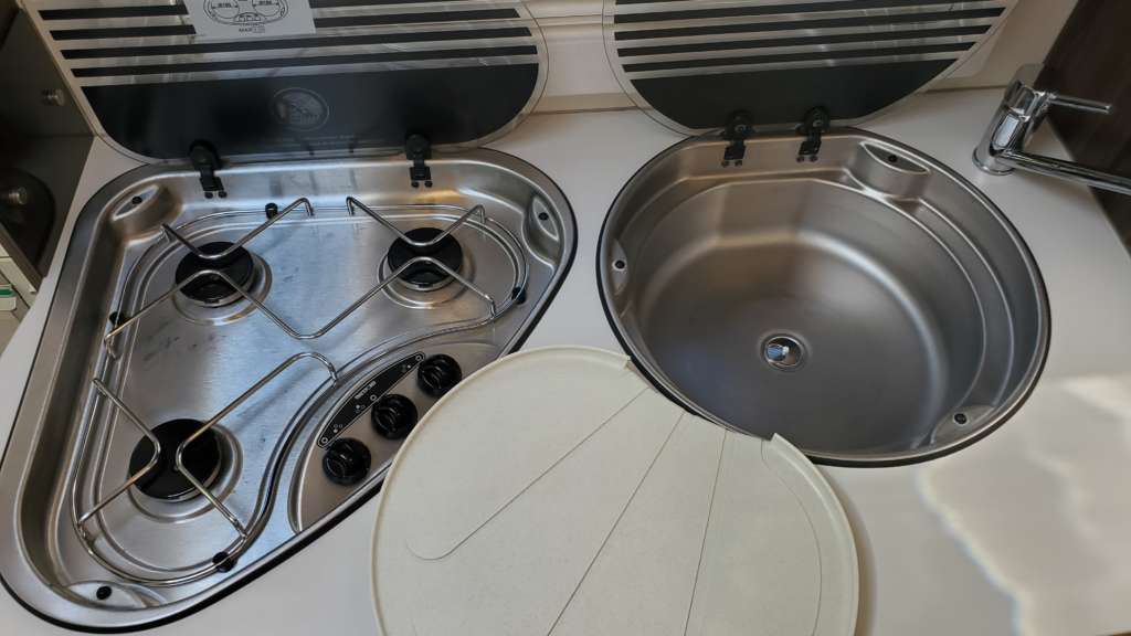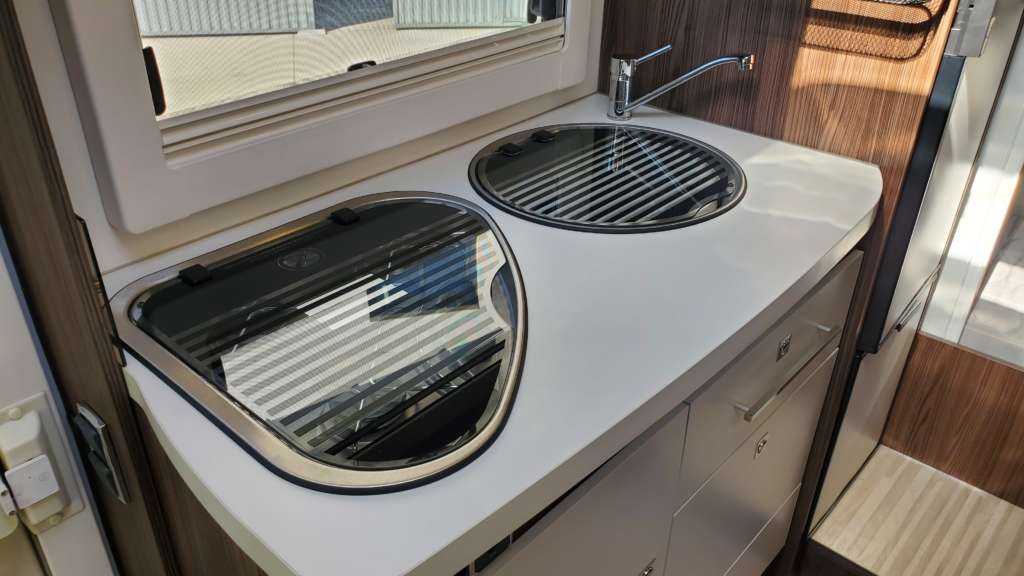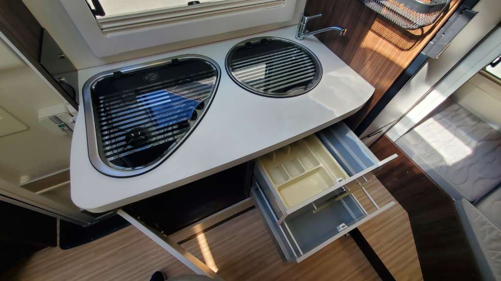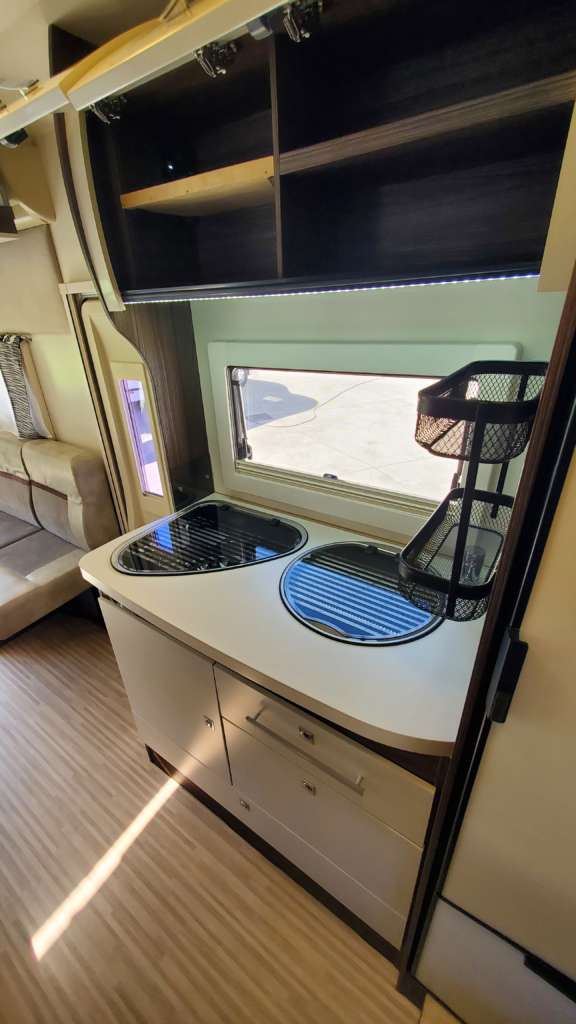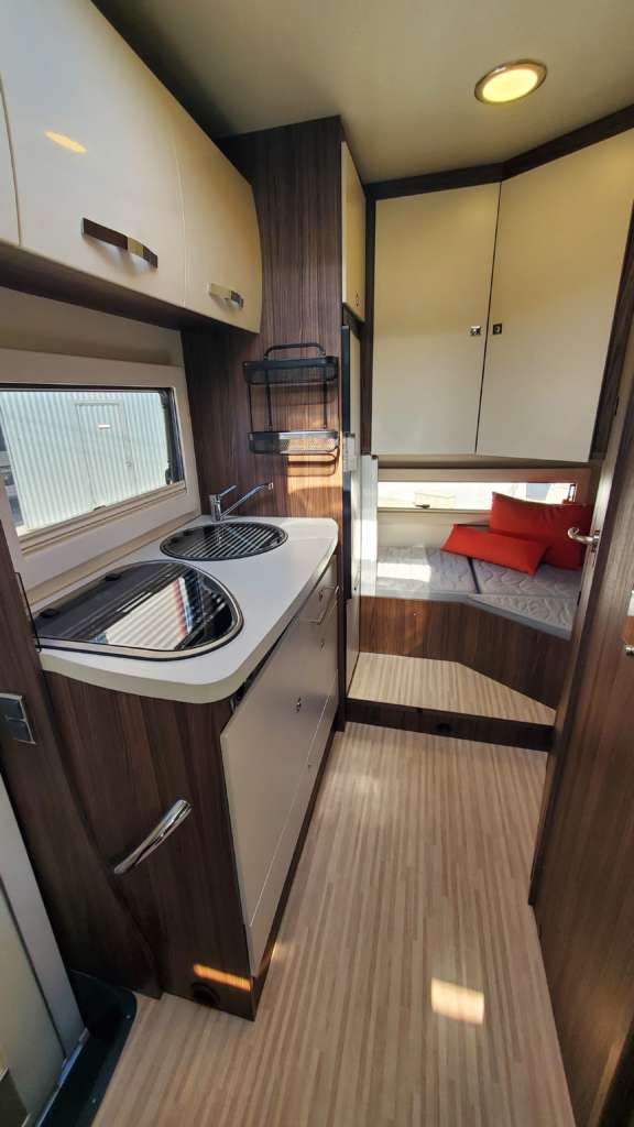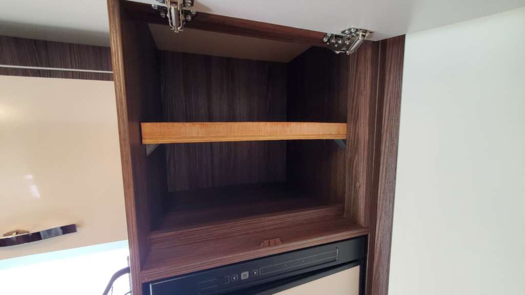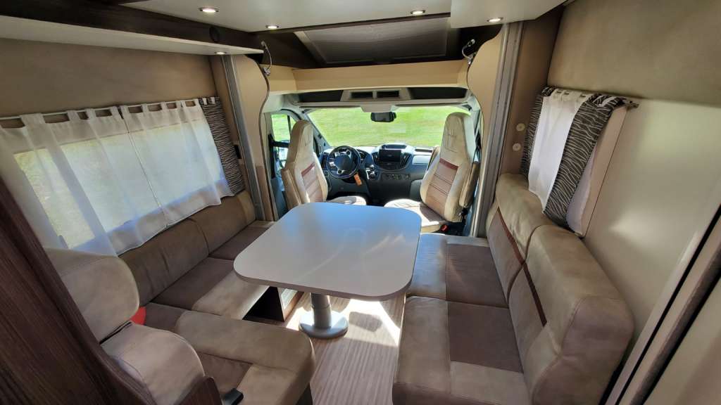 Cama 1 plaza desmontable en la zona trasera Cama suspendida de techo eléctrica 2 PLAZAS (máx. 230 kg) Cama suspendida del techo (cm) : 140/120×191 Comedor (cm) : 140×210 Gran frigorífico 140 l con cajón independiente para 9 botellas de 1, 5 l.